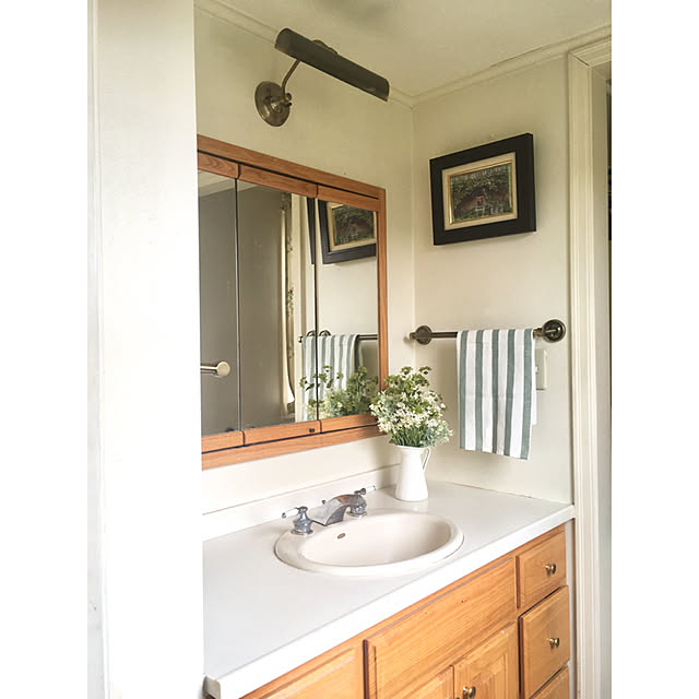 それだけだとやはり少しぐらつくので下の方で洗面台のタイルに防水性のありそうなビニールテープで軽く固定しています。