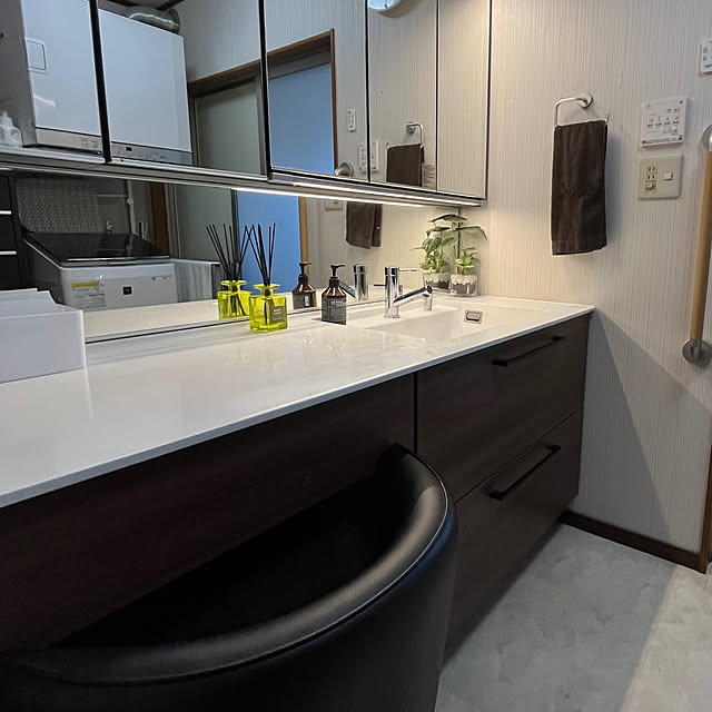 我が家の洗面台は幅が狭くてこじんまりとしています。 ボウルとカウンターに段差がない、アイカのスタイリッシュカウンターを採用したところがこだわり。 間接照明はLEDテープライトを購入してDIYしたばかりです。 コンセントとコードの処理に悩み中。。😅