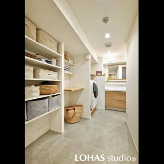 イベント参加 超繁忙期&トラブル&ダンナ海外出張でワンオペ中です💦が、10月一枚も投稿してなかったので、久しぶりの投稿です😅 洗面カウンターをL字にして、作業スペースを作りました。 洗面台の下は引き出しをつけず(予算が足りず)ベンチを棚代わりにしてます😊 銭湯のイメージにしたくて、カゴにパジャマやタオルを入れてます😊