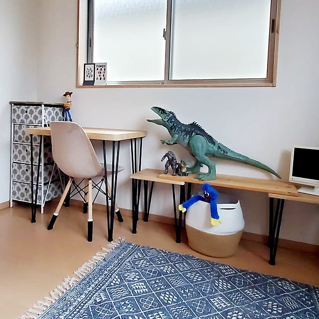 最近息子も 「自分の部屋が欲しい」と… まだ昼間のうちしか使わないので カーテンなどないですが ぬいぐるみなどは ランドリーバスケットに入れて… 簡易的に作った棚に 大きな恐竜などを… 少しづつ部屋らしく 散らかっていくのかなf(^ー^;