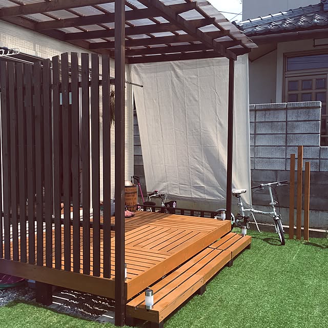 杉材で作られたパーゴラとウッドデッキ。 自然材だからこその優しい温かみを感じれる空間が気に入っています。 我が家ではセカンドリビングとして使っています。