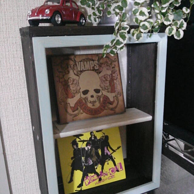 最近、隣室のダークさが浸食しつつある寝室。3段ボックスが5つ並ぶ収納の上。白とグレー、差し色にグリーンだったけど徐々に黒と赤が増えていく(笑)