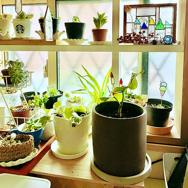 黒板塗料の黒と、壁はグレー、あとは木材の茶色ときてるので、差し色にもあり?(笑)とか。