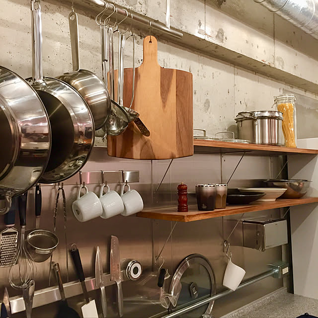 キッチンシェルフ上半分の現状。 キッチン収納はあれこれ悩んだ末、無印のステンレスユニットシェルフにしたんだけど、狭小住宅なので収納は上に上に、ということでガッツリ組み上げている。笑 本当は腰高にして、木の天板を置いてカフェっぽくしたかったんだけど、収納力を優先🙏🏻 やはり高さがあるとけっこうな圧迫感があるので、棚板はステンレスじゃなくて、ホワイトかウッドが良かったかなあと、組んでから悩んでいる。。笑 でもステンレスって可愛い🩶