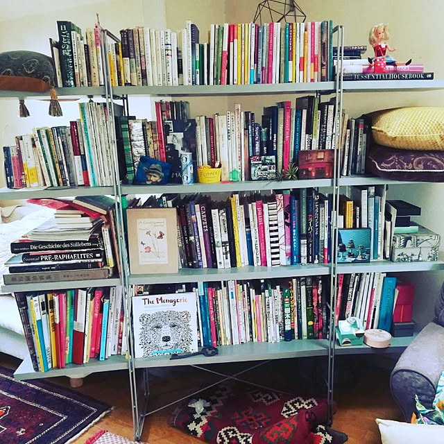 1 寝室ゾーン🛏️ ニトリのスチールデイベッドフレームを使ってます 天蓋ぽく垂らしてる布は、ダイソーのテグスでIKEAのLILLカーテンを吊り下げているだけ。 奥のスタンドライトはリサイクルショップで5000円で購入しました💫 2 作業ゾーン🪑 ニトリのNポルダを仕切りにして、その後ろに紐のれんをぶら下げてます 関家具の椅子にめちゃくちゃ布をかけてしまっている😂 3 リビングゾーン🛋️ 人が来た時にも対応できるゆったりした空間にしています 奥の一人掛けソファはコルビュジエのリプロダクト。リサイクルショップで5000円でした 手前のソファはカリモクのよくある形のキャメルが珍しくて購入、 真ん中のテーブルはリサイクルショップで900円でした😂 4カフェゾーン☕️ ニトリの棚にざかざかっと並べてます 中の収納に使ってるかごもほとんどニトリ 電気ケトルはおばあちゃんに譲ってもらいました〜🌸