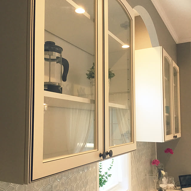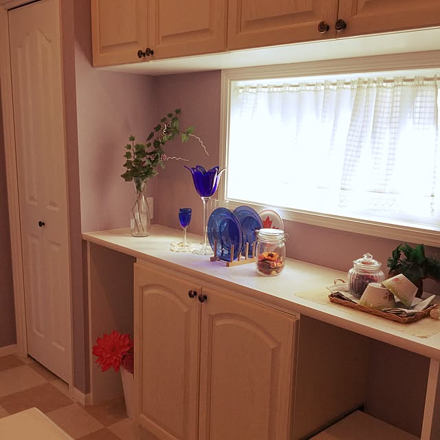 L字型キッチン。家を建てた当時はタイル貼りが人気でした。 キャビネットは輸入品で木目が気に入っています。