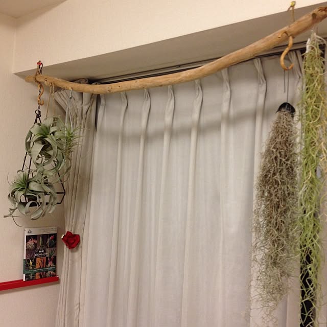 流木、釣り紐で吊るしてグリーンを飾りました。 引っ越してもう少しで2ヶ月。アチコチ壁に穴あけてる(^^;