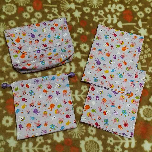 100均の風呂敷1枚から ○レッスンバッグ(約40×30cm) ○ポーチ(約16×11cm) ○ポケットティッシュカバー(約11×9.5cm) を作りました! 開口部に処理済みの端が来るように断裁するのが時短のポイントです♪ 縫い目は粗めですが、全て手縫いです! 裏側で見えないので良しとしました^_^ 材料は全て100均で揃えて、全部で550円(風呂敷1枚、糸1巻、チャック2本、バッグ紐1本)でした♪