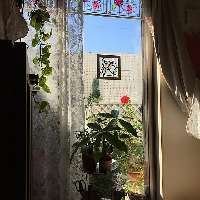 窓に直接貼るのは剥がすとき大変そうなので、ガラスフィルムの上にペタッと貼りました😊