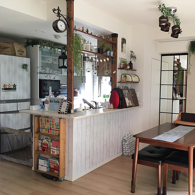 我が家のダイニングカウンター おそらく見えている椅子以外はALL DIYですw カウンターテーブルは、訳ありモンキーポッドを買い付けて作成w 260cmx60cm程度あるので3人掛けでもゆったりご飯ができます🍚 キッチンとのカウンターも新築時から一部取り壊して、ダイニング収納として引き出しをつけたり、ティッシュケースにもなっていますw カウンターあるあるのティッシュ1箇所だと不便問題も両脇に設置して解決です(笑) 作成の様子はHPでも紹介していますのでよろしければご覧ください♪ https://sites.google.com/view/lets-dododo-neo/ホーム