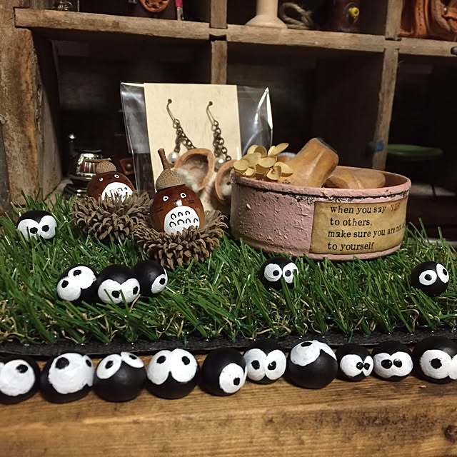 棚の上を改装しました。 まっくろくろすけは、モミジバフウの実です。 実を黒く着色して、目玉をつけただけです。 先日 新たにモミジバフウを拾ってきたので、それは何を作ろうかと思案中です( ^ω^ )
