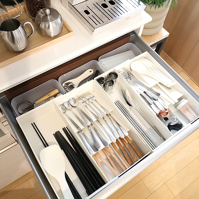 よく使う調味料はこちらの引き出しへ。 白いケースのふりかけ穴タイプにカレーパウダー、胡椒、○穴タイプには爪楊枝と岩塩を入れています。 量の多い調味料(コンソメ、白湯、鶏ガラ)は銀の蓋のPPケースに入れました。 量の多いものはダイソーの白い長方形の調味料ケースでいけるかな?とサイズを計らずに買ったら我が家のキッチンには入らず… なかなか丁度良いサイズ&ピッタリハマるものに出会えずやっとこの銀フタケースがピッタリハマった時はほっとしましたε-(´∀`; )