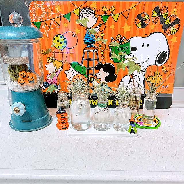 キッチンカウンター下の飾り棚です。 Morozoffのプリンの空き瓶を並べて飾ってます。 100均の瓶にはエアープランツを入れてインテリアにしてます🌿