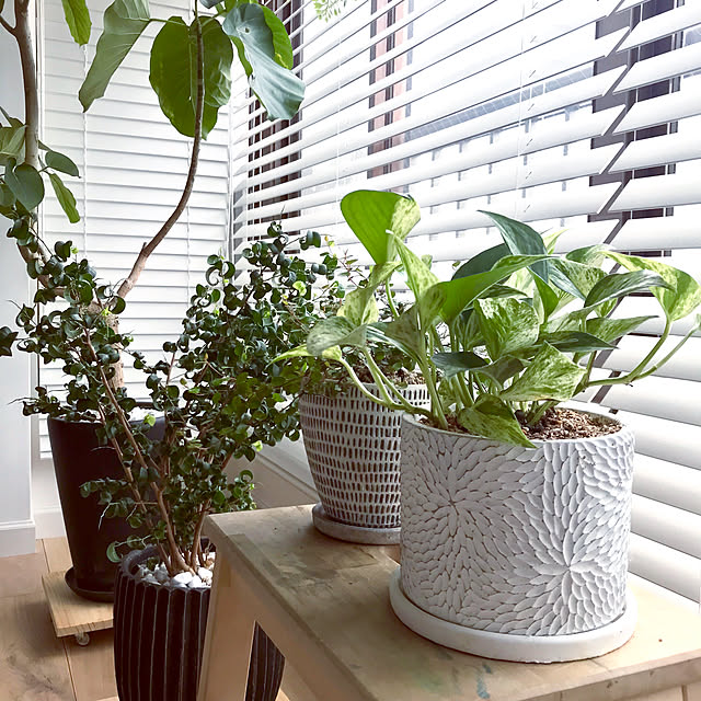 お気に入りの鉢、イベント参加です。 ちょうどポトスとワイヤープランツをインドアグリーン用に植え替えしたので参加させてください ♪ お部屋のカラーに合わせて4、5号鉢の方は白×グレーにしました。 彫ってある感じが可愛いらしくてお気に入りです☆彡