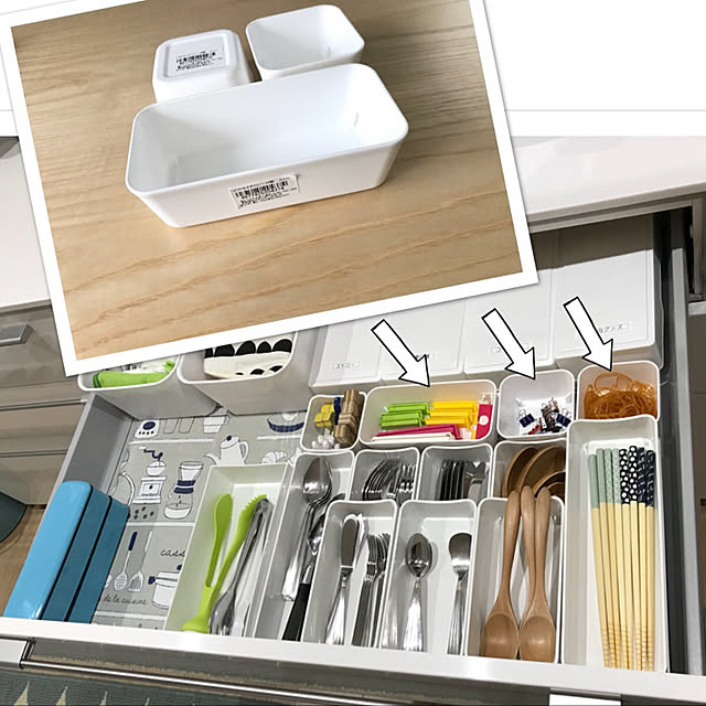 キッチンの引き出し収納にニトリの整理トレーを使ってます。一部、セリアのトレーも使ってます(^^)
