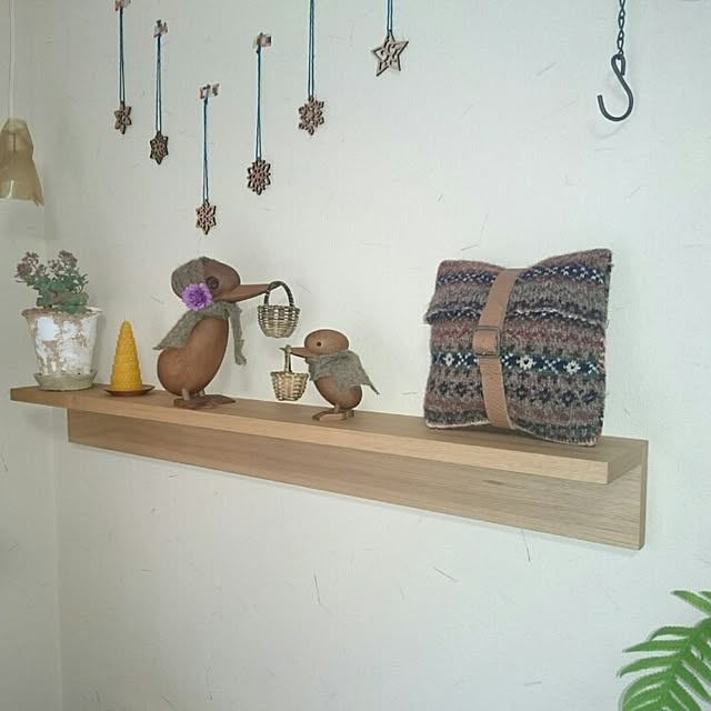 ディスプレイシェルフにはお気に入りの作家ものがいっぱいです🥰 わかる範囲でご紹介します💕  【壁・天井】 ★シカのワイヤーアート(作家: HAyUさん) ★ペンダントライト擬灯(作家: 中村秀利さん) 【シェルフ上段】 ★ボタニカルキャンドル(作家: IRISさん) ★流木の見返り美鳥(作家不明) ★ヴィンテージ花瓶 (作家: リサラーソン) ・アンティーク風額縁 ・フェイクグリーン 【中段】 ★アンティーク洋書のような本型カレンダー(作家: 山香デザイン室) ・ラッピングストーン(山と猫で購入) ★木工の一輪挿しオブジェ ×3(作家: 市川岳人さん) ・枝型キャンドル(ハチ蜜の森キャンドル) ・大理石マーブルアップル ・ウミウチワ(round robinで購入) ・LINDFORMのミニ花瓶(スパイラルマーケットで購入) ・ペーパーブランクス ノート
