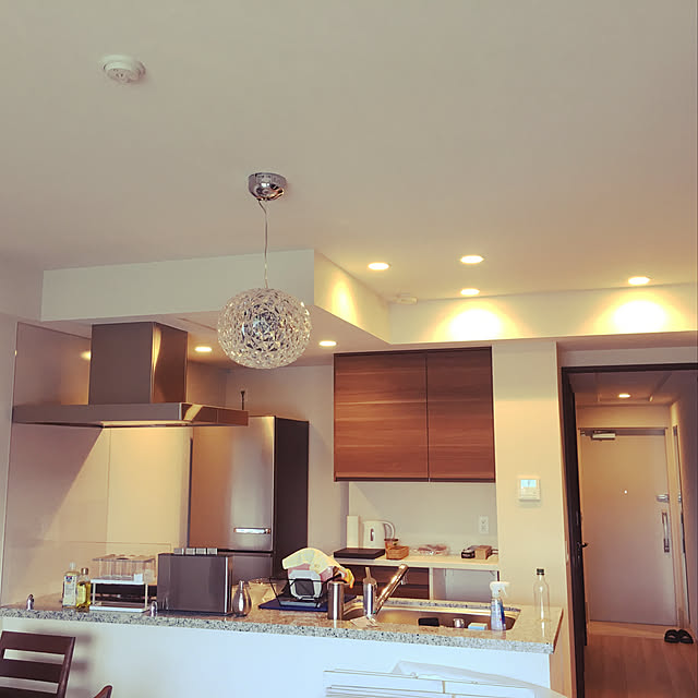 建売住宅のため、希望のオープンキッチンではありませんでした。キッチンの壁にWALPAで購入した壁紙をDIYで貼りました。キッチン奥の壁紙も貼りました。ダイニングテーブルはフランフランですが、色を少し塗っています。
