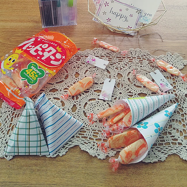 動画内で先生がブーケの形をしたやつを作ってハッピーターンを入れていたので私もやってみました♡