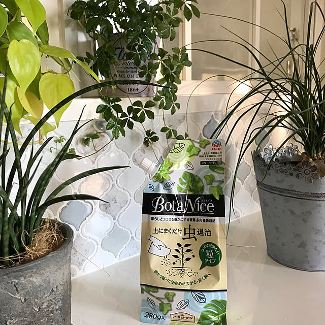 Bota Nice の土にまくだけ虫退治をあちこち散布しています。袋を傾けるとパラパラっと白い薬が出てきて、どれくらい出たかも分かりやすくて簡単。 量も少しで良いのでまだまだ使えそうです。 今度から新しく植えつける時には底に薬をまいておくとよいらしい( ˙꒳​˙ )フムフム…
