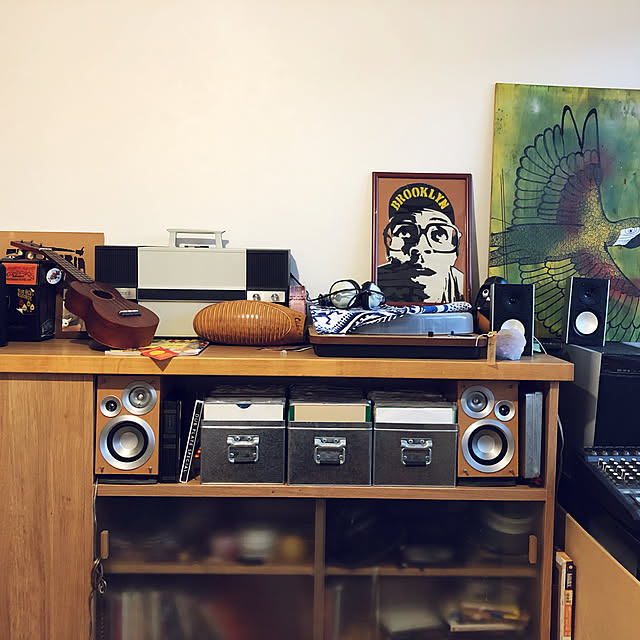 お気に入りのキャビネットはボーエモーエンセンのヴィンテージ。 生活用品を中に納め、キャビネット上はレコードプレーヤーを置いて音楽コーナーにしてます。