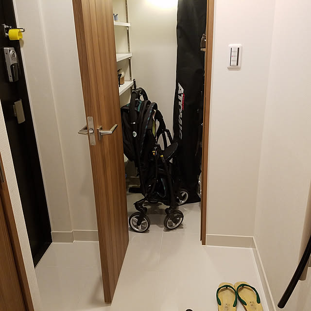 今までは玄関ドアの明かり取り?の部分にしかモップを置く場所がなくて不満でしたが、靴箱の段を外した事によって、掃除道具も入りました👏