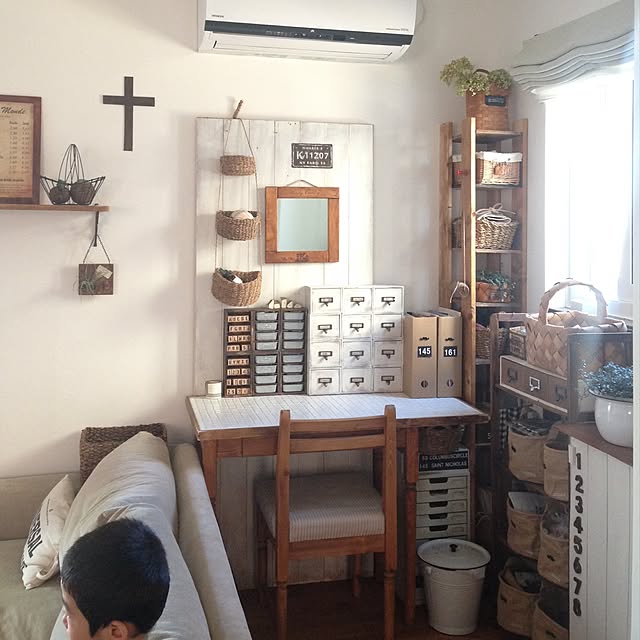 遂に机を欲しがりだしたので、リビング横に机スペースを作りました。 届いてから1週間以上経ってようやく片付けただけ〜。 こう写真で客観的に見ると奥のチェストはもう少し左の方がバランスいいよなぁ。