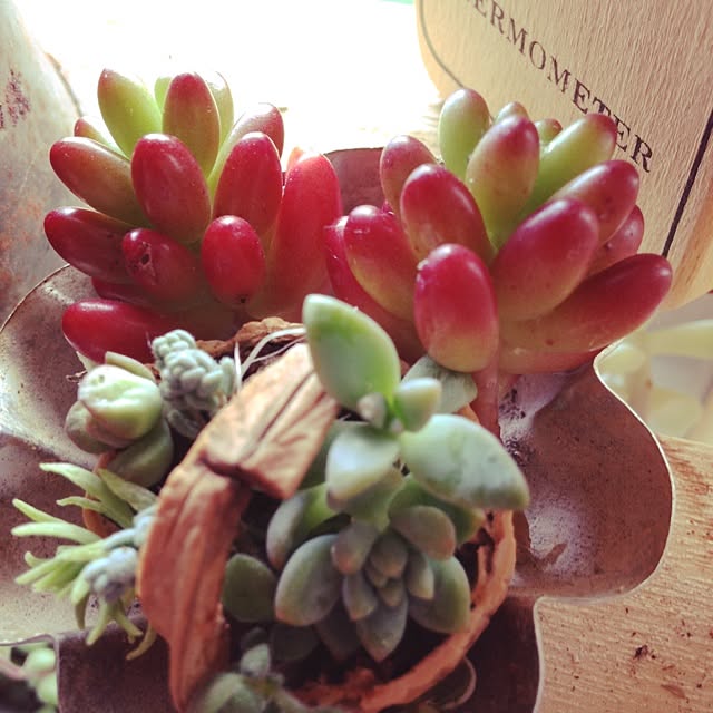 地味な色合いになってしまいましたが(^◇^;)寄せ植えしてみました♪ いとうぐりーん産のフーケリーをメインに♡我が家の花壇から少しだけ摘んだセダムと、虹の玉などのつぶつぶ系をたくさん使っています。星の王子はアクセント?!になっているかな?(笑) ルビネは雪を被っても元気だった鉢からカットしました。 実は初めてお友達にプレゼントしようと思って寄せ植えしたものなのです(⑅˃◡˂⑅)まだまだ多肉初心者の私がプレゼントなんて!不安もあるのですが…しばらく様子を見てきちんと根付いたのを確認してからプレゼントしようと思います♪