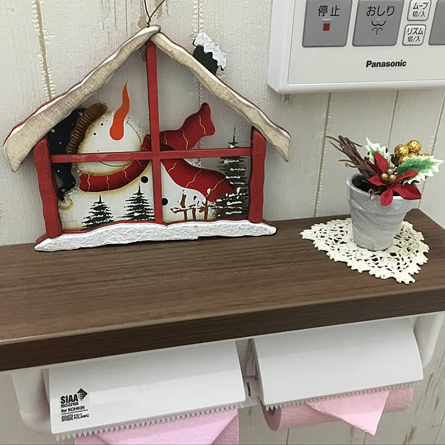 こんばんは~(*^^*) セリアのクリスマスランタンミニ灯籠?だったかなあ?(ごめんなさい名前忘れちゃいました) タッチセンサーLEDペンダントライトの上で… キッチンからみてもリビングからみてもサンタさんと雪ダルマさんお顔が同じに描かれているので後ろ向きがないので、可愛い~です。 ライトのしたに見える緑はレモンユーカリ 奥の壁にはposauruちゃんからのワイヤークラフトとレジン~♡