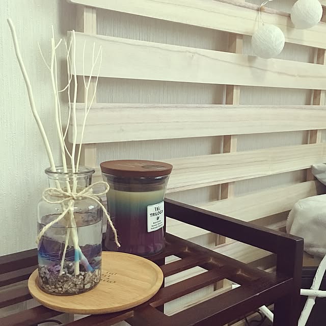 フレグランスディフューザー…ではなく、簡易加湿器をDIY☆ 液体がただの水なだけなのですが、乾燥してカラッカラになるので、試しにディフューザーを応用して100均グッズで作ってみました♪ 枝型のスティックだけFrancfrancで購入。