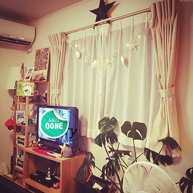 玄関のデニムガーランド、屋根がある所ですが、風雨にさらされてだいぶクタクタになってきました。