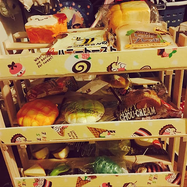 次女の部屋 スクイーズが散乱してたので家にあった廃材で棚を作り飾ってあげました 喜んでくれましたよー 家にある物で作ったので0円(笑)