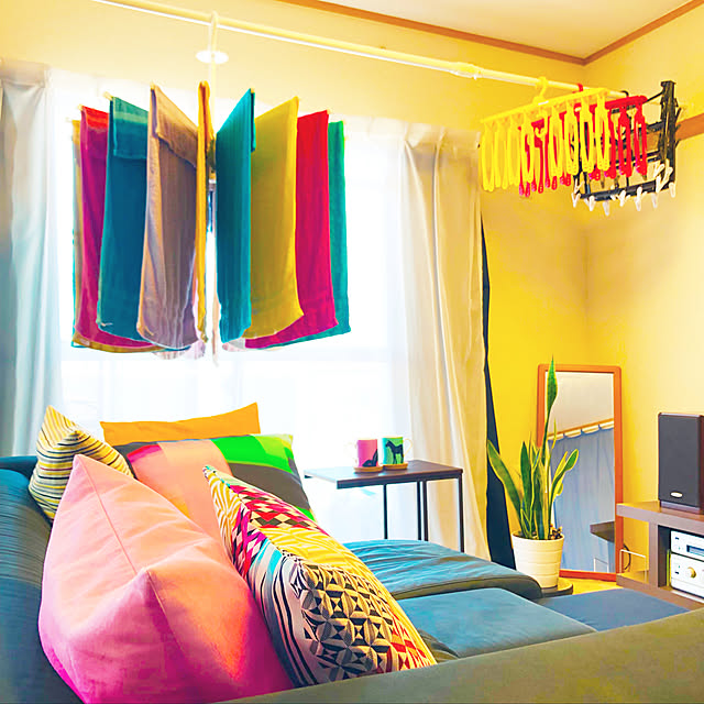 FABRIC'Sで購入したカラフルな幾何学模様のクッションカバー🩵💛🩷 モノトーンな物が多い空間ですがクッションカバーだけは賑やかなわが家です🎨