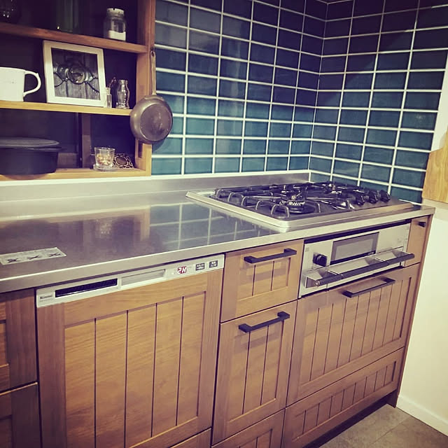我が家のキッチンはウッドワンのスイージー。工務店選びの際たまたま見学させてもらったお宅で、その雰囲気に主人が惚れ込み、ウッドワンを採用してくれる工務店を基準にした程。そして一番のお気に入り、ガスコンロはハーマンのプラスドゥです。無骨でレトロな感じに惹かれ、主人がどうしても取り入れたかったモノ。両面焼きグリルとタイマー付きで使いやすいです。