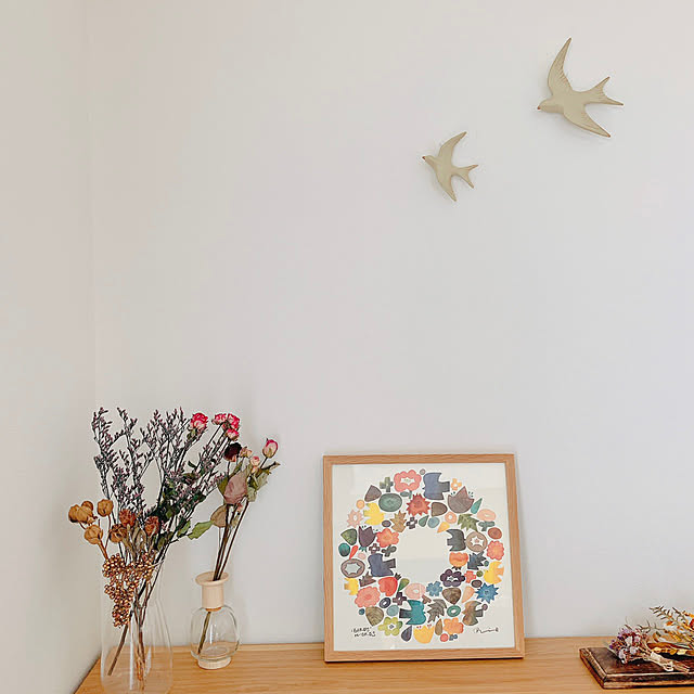 リビングの一角 トリさんモチーフの雑貨と一緒にバーズワーズのポスターとシルクスクリーンを飾っています 優しい雰囲気をまとった自然物がモチーフになっているのがお気に入り🥰 私にとって ほっとひと息つける空間になっています♡