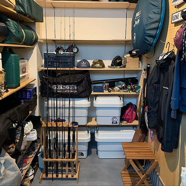 土間収納はキャンプ用品や掃除道具を詰め込んでます!大きいBOX類は下に、テントやギアはカッコよく見えるように意識してます☺︎