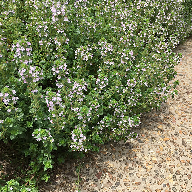 今年も駐車場の目地のタイムが咲き出しました! よくクリップして頂いてますが、ここでデメリットもお伝えしておきます笑 最初の数年は綺麗ですが、どんどん雑草も生えます。雑草は抜き辛いです💦枯れ葉等も絡まります🍂 ずっと車の下で影になる所ははげてきます。 花後は切らないと、夏にものすごい勢いではみ出しますので剪定必須✂️ 長々と書きましたが、、 この時期は車から降りるとフワッとハーブの香りがしてなかなかいいです😌