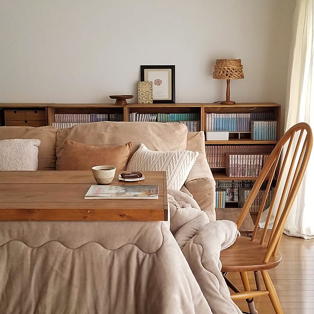 こたつのある暮らし🤍 ひとり用こたつがとっても活躍中☺️ 寒くなってきたので もこもこ毛布に変えてます🤍 狭いリビングでも こたつ生活楽しめてます🫶✨ このサイズなら圧迫感もなくて お気に入りです🥰