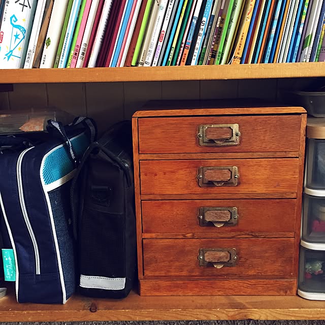 和室にある息子のスペースを少し見直しました。 やはり棚が足りないので買い足し必須。 もっと余白が欲しいけど、少しはスッキリしたかな? 息子カラーにしてあげるため、悩みに悩んでいたHAYのコンテナを30%オフでやっと買ったら、ティールブルーが実は在庫なかったとなって届かなかった😅グラデーションに出来なくて残念。 ・無印のファイルボックスに教科書などを。 もう1個入るからシンデレラフィットさせる予定✨ ・コンテナにマスクとポケットティッシュをざっくり収納。(その下のコンテナにはあまり出番のないLEGOのボードと取説を。) ・IKEAの引き出しには体温計、ボールペン、赤ペン、スタンプ、ハンコなど学校の準備に使うものを収納。 たまにしか持って行かない絵の具セットはその上に。←こーゆーのの定位置、本当困る。 ・OYOYのカゴにSwitchの移動用バッグを。 これは定位置が決まってなくて、毎度ママ〜ソフト入ってるやつどこにある?って聞かれるので、見やすく取りやすい場所に定位置を😅 その他、鉛筆削りや折り紙など学校で使うのは全部ここに置くことにしました。 学用品とおもちゃはわけたいところだけど、遊ぶ場所と準備する場所が同じなので仕方なく混在。 どちらも自分で片付けて欲しいので、見やすくわかりやすく、取りやすく、楽しくがテーマ。 コンテナが我が家にあっているようで、持ち帰ったプリント置き場にも使ってます。 (作り置きのLEGOもコンテナ収納にしてから本当使える😂オススメですw) 夏休みで困った、鍵盤ハーモニカや引き出しなど休み中に置いておくスペースも今後作りたい! そして、見えたくないキャラグッズやシールなど彼の宝箱として、カラーストレージを導入。 ブルーだし、喜ぶといいな♡
