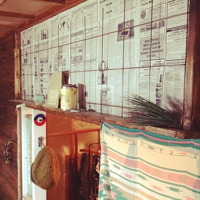 土壁隠したくて英字新聞とワイヤーで棚作りました。