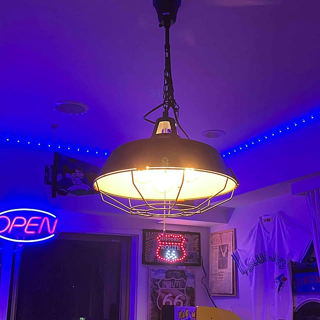 ニトリで購入したアメリカンな雰囲気の電気です!明るさもある程度調整が利くので、酒を飲むときは少し薄暗くしてます。