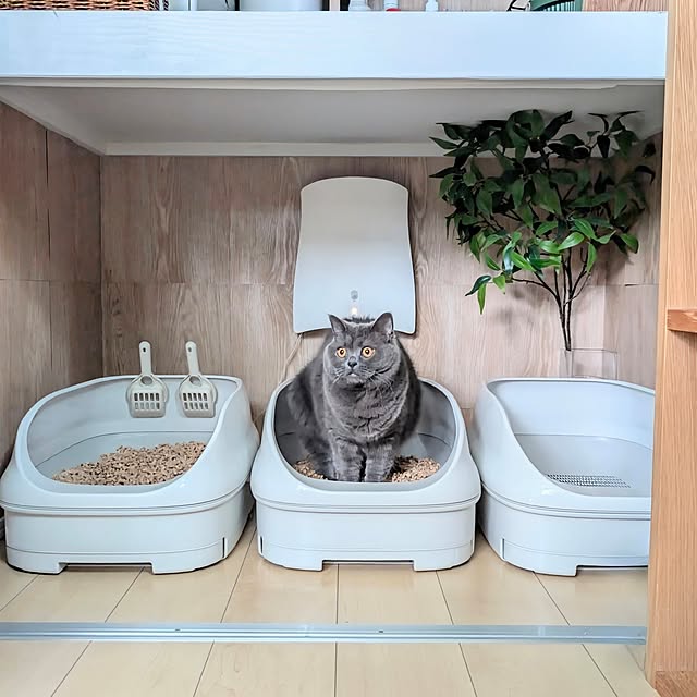猫トイレは3つ設置していますが その一つが 「ニャンとも清潔トイレ」です。 DIYで枠を作って隠しています🌳