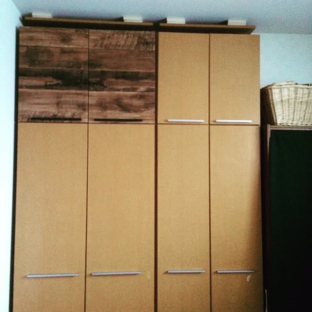 左奥に見えるクローゼット扉も古材風壁紙で貼り替えたいと思ってます。