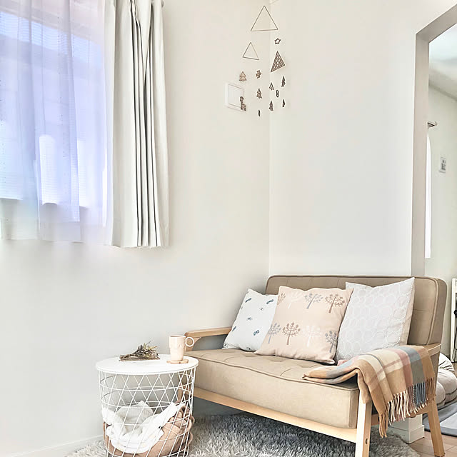 明るい窓辺はグリーンたちの定位置🪴 リノベ前の間取りの関係で?窓の隣に勝手口があるのですが、ここは使わないので封印。(ベランダは窓から出入り)二重ドアなので間にコットンボールの暖簾をかけたらより好きな雰囲気にꔛ‬ෆ RCショッピングで購入したお気に入りのハンギングやモビールもここに。 私の癒しの窓辺インテリアですෆ‪.*・゚