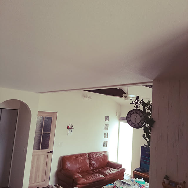 テレビ台と時計もダークブラウンなんです なのでこちらからだと ダイニングテーブルはあまり気になりません😂 ホワイトグレーも好きだけど ダークブラウンも残したい だから悩むんですよね~💦 テーブルは白にしちゃったし🤣🤣