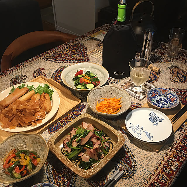 少し前の食卓の様子🖤 イカのマリネ🦑 エビとマッシュルームとオリーブサラダ🥗 せせりとししとうのグリル この日は大好きな白ワインで乾杯しました🥂