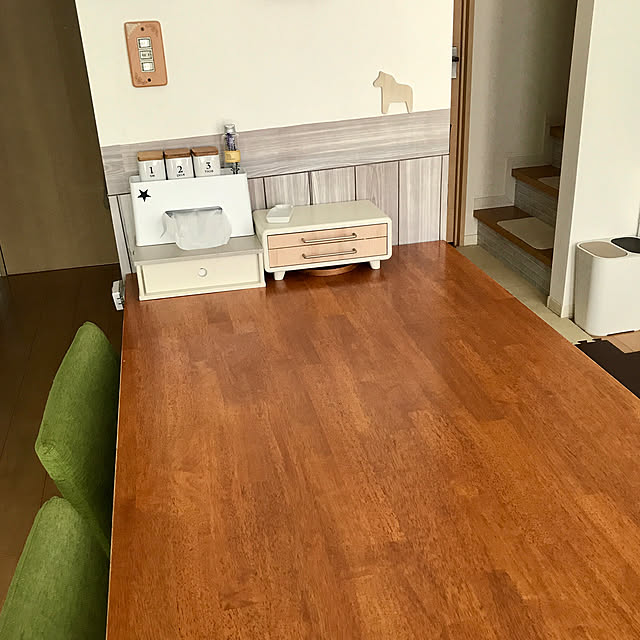 クッションカバーは大好きなフランフランのものと、300円ショップのもの。 ダイニングテーブルは中古で1,000円くらいで買った千趣会のものをこげ茶からアクリル絵具でオフホワイトに。 ガラスの天板が素敵だし、ものや書類を置けるスペースもあってこれも当たりの買い物でした。