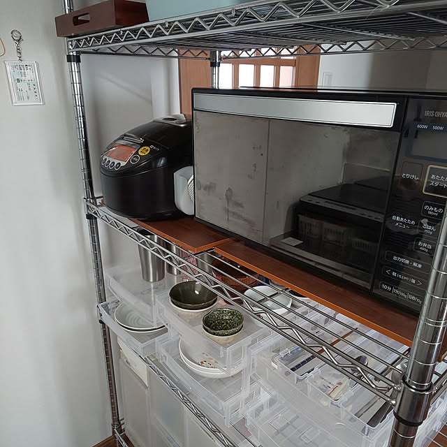 食器棚買うまでメタルラックに無印とセリアの収納ケースで代用。