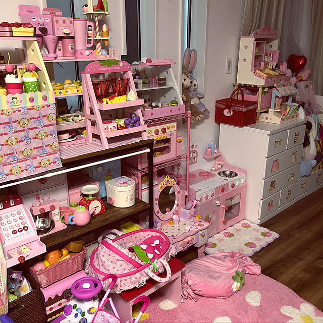 マザーガーデンのキッチンをリビングに出しました。 パステルカラーのかわいさに一目惚れで購入しました。娘もとても気に入ってくれているので嬉しいです。 カーテンもパステルピンクでプリンセス風に作ってみました。