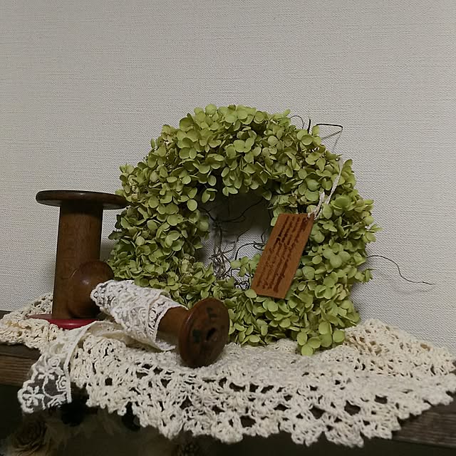 アナベルリースを作りました。 もう少し緑色が濃くなるまで、収穫を待つつもりでしたが、台風で折れるよりマシかと思い、早めにドライにしたので、色がイマイチです(TT)