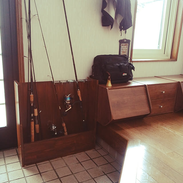 壁に釣竿をワンタッチでピタッと整列出来るように自作してあります。